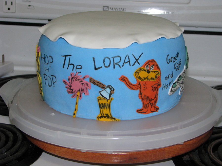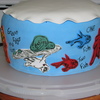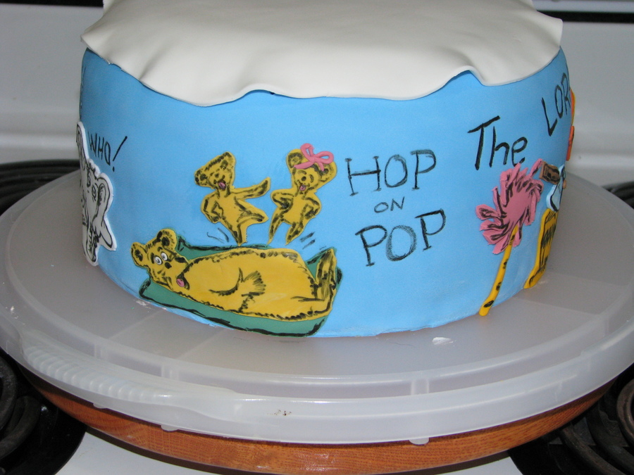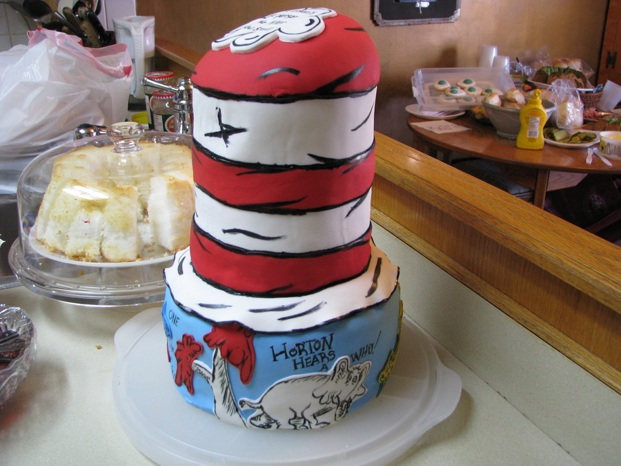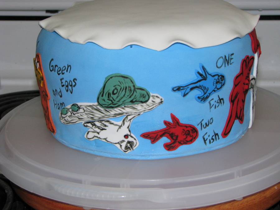This is my attempt at dr.seuss/cat in the hat, inspired by brea1026!!! I did a different take on the bottom cake trying to add in different Dr. Seuss books. This was my first time covering a cake this tall and I had a bit of problems with the fondant, so Its not my favorite cake, but fun none the less. Bottom cake has Hop on Pop, Horton hears a who, green eggs and ham, the lorax and one fish, two fish..... Bottom pictures are from before hat was added and decorated. All on fondant and hand painted/drawn on.