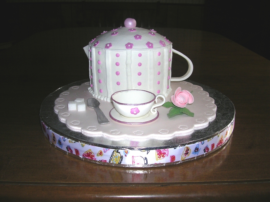 Teapot is 3 layers of 6 inch rounds, the bottom two are leveled and the top layer baked without bake even strips to create the rounded dome on top. Iced in buttercream with fondant and buttercream accents. Cup and saucer, spoon and rose are all gumpaste. Doily is fondant brushed with pearl dust and imprinted with a flower cutter. I made this for my mom's birthday.