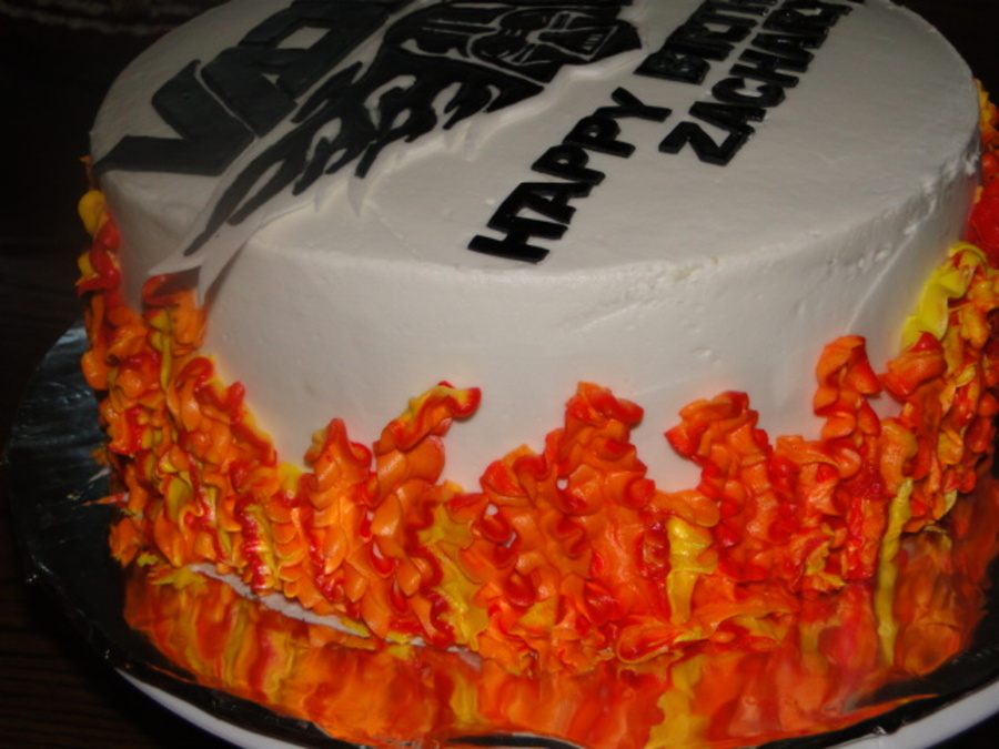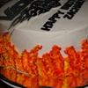 9 inch yellow cake with white BC. Fondant plaque and letters, three colors blended on side for flames made for same customers from year ago. Thanks to all CCers for the inspiration