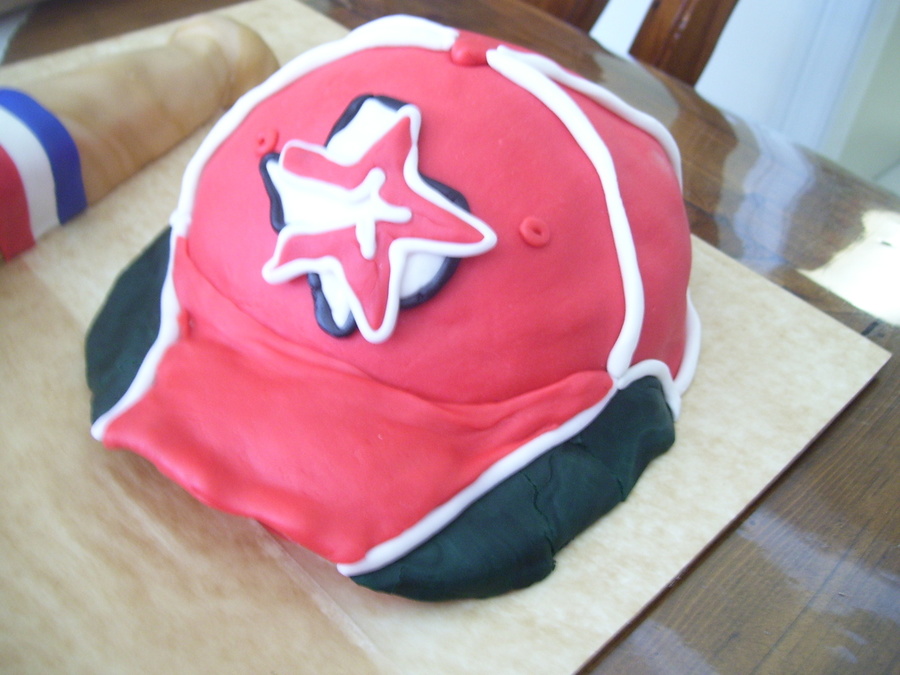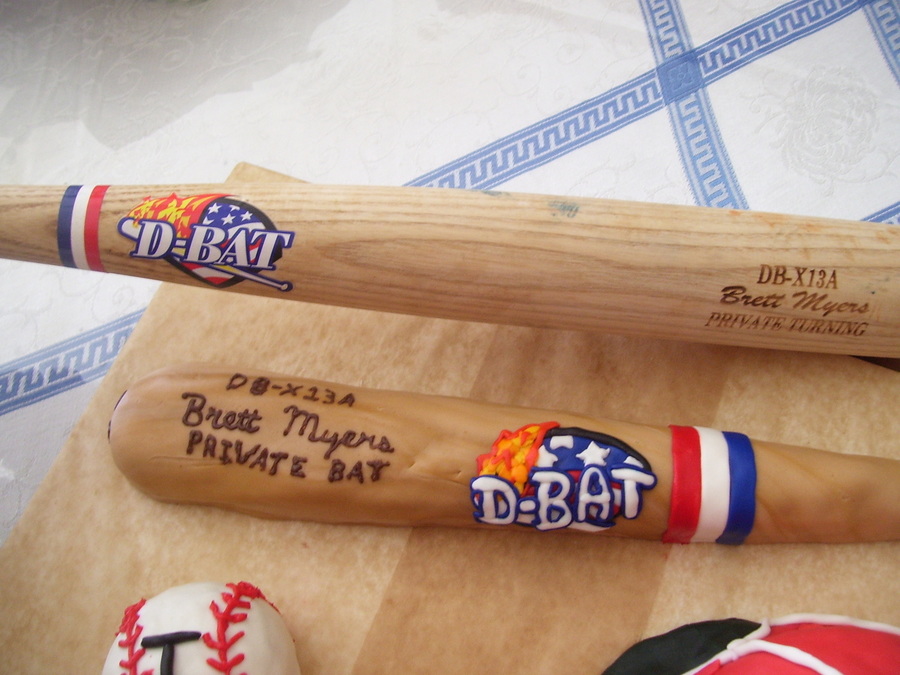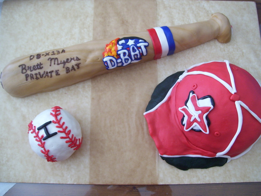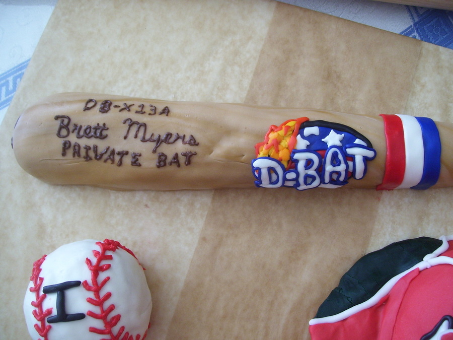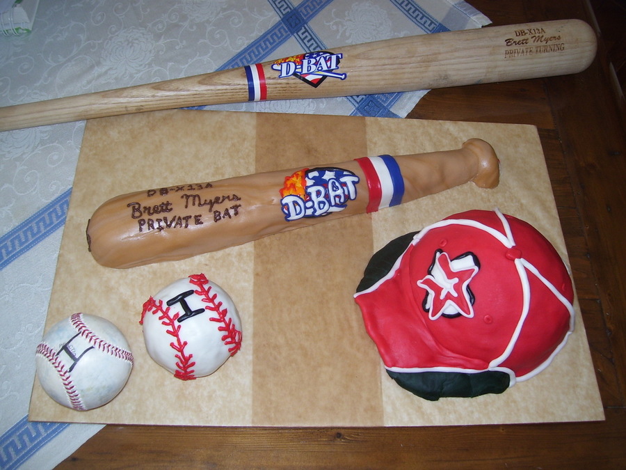 This was for my little brothers 8th birthday. All is edible and made out of fondant. The bat was given to my brother from Houston Astros ace pitcher Brett Meyers at Spring Training FL. The ball was given to him by former Astros closer Latroy Hawkins.