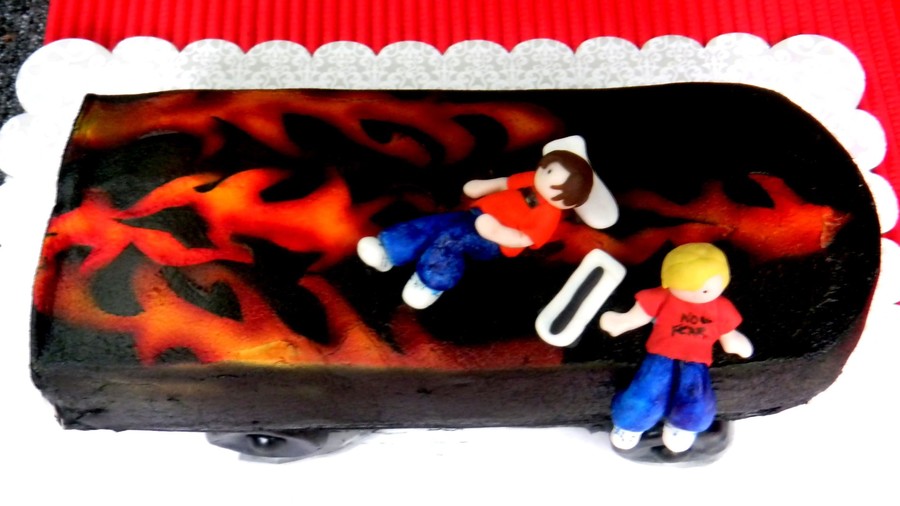 Two gumpaste figures atop chocolate mint cake w/bc frosting. Airbrushed flame details gumpaste wheels. TFL