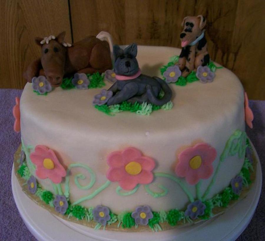 Chocolate cake and filling. Covered with MMF, animals and flowers modeling chocolate w/ buttercream decorations.