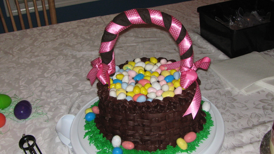 I know that I got the inspiration for this cake from great cakers here on CC's - thanks for the inspiration. It's a chocolate cake with chocolate icing, chocolate modeling chocolate handle, real ribbon and eggs from the store. It went over really well with the inlaws as it was actually a birthday cake. Thanks for looking