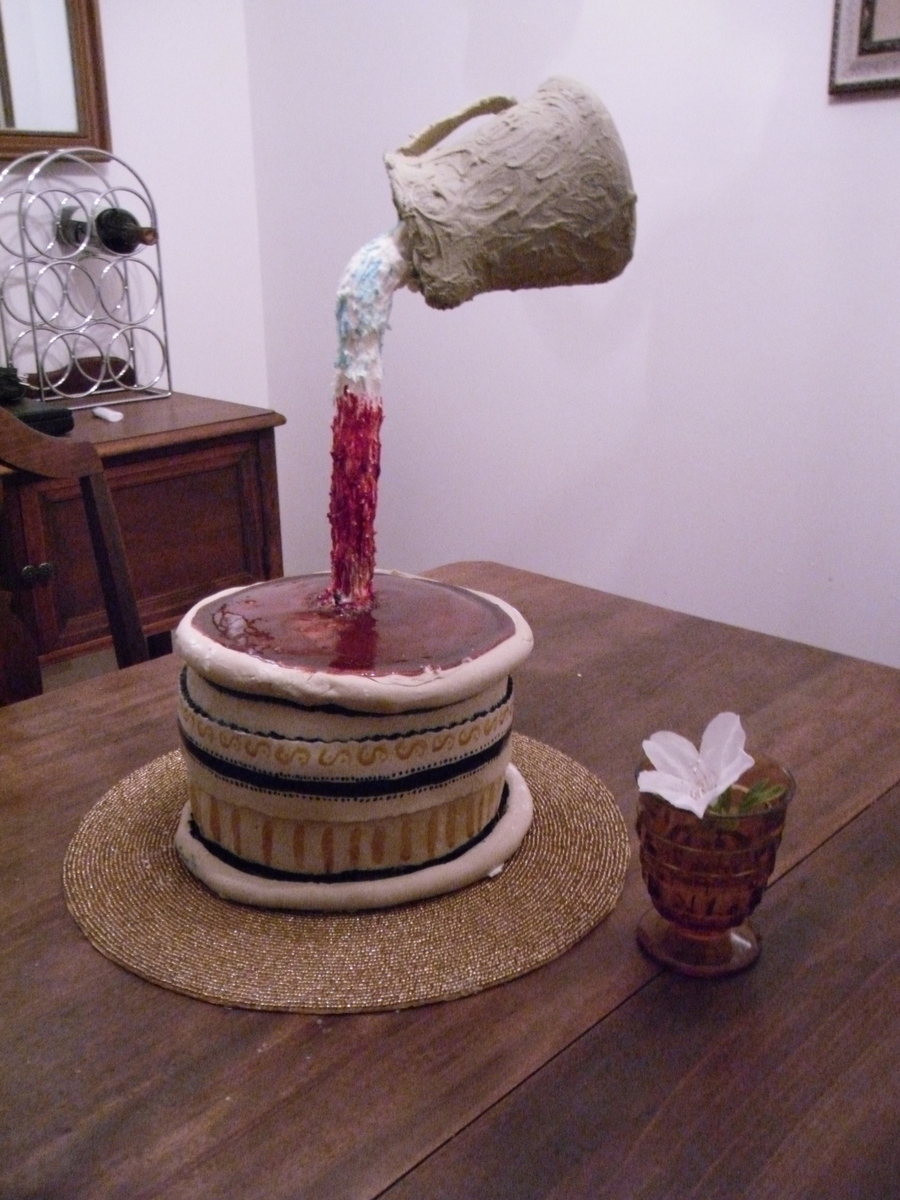 I made this for the end of my girls' rosary group and my friend's engagement. The Wedding at Cana seemed to incorporate both events well, so I went with a water-to-wine theme :) The fondant work is a little sloppy, as is the painting- but I was more excited that it held up! The water pitcher is made of gumpaste and coated in royal icing- so it was a lot heavier than similar beer can cakes and I wasn't sure if it would stay suspended.