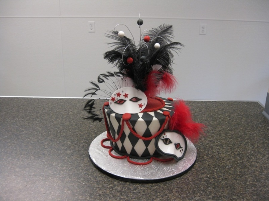 Birthday cake with a masquerade theme. Design a hodgepodge of several cakes I saw here on CC. Chocolate cake with chocolate mousse filling and vanilla BC. Masks are gumpaste, feathers are feathers and the rest fondant. Thanks for looking!
