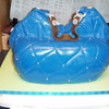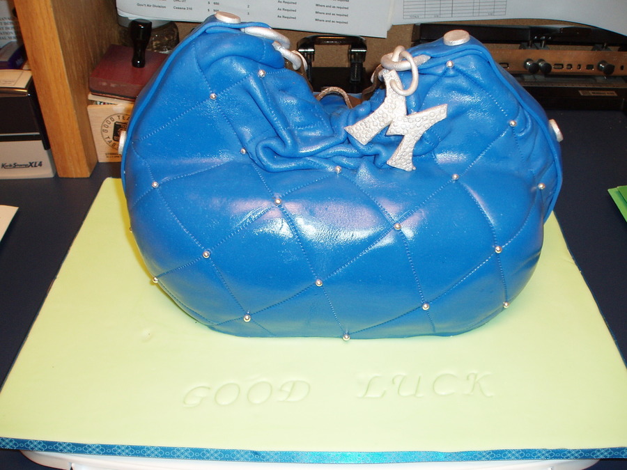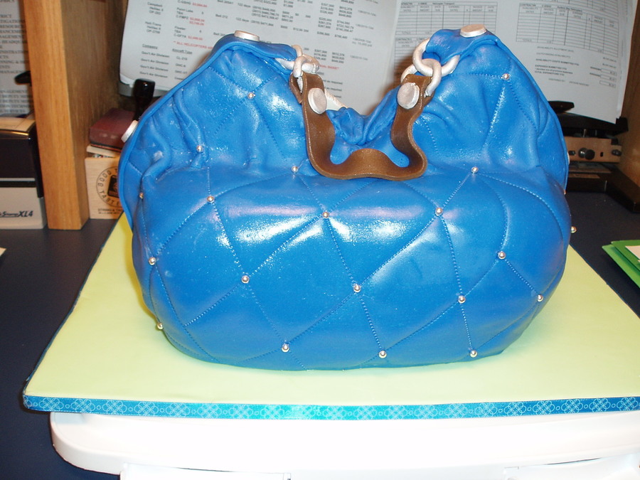 first purse cake for coworker that was leaving for greener pastures. bottom layer choc.fudge cake with choc.ganache, top layers vanillia almond cake with freezer strawberry jam, cake covered with mmf and gumpaste strap.