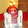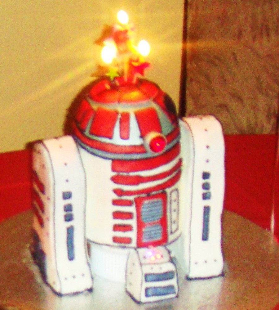 my little guy wanted rtd2's red cousin. Had both glowing and blinking lights. 6" rounds w/ sports ball for top. Fondant accents painted with metallic glaze. This cake gave me FITS from start to finish. UGH!