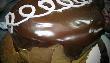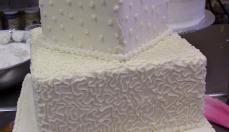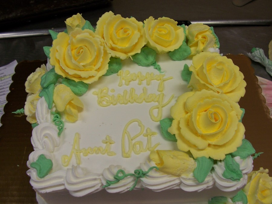 fruit cake peaches and strawberrys inside whipcream outside and whipcream roses