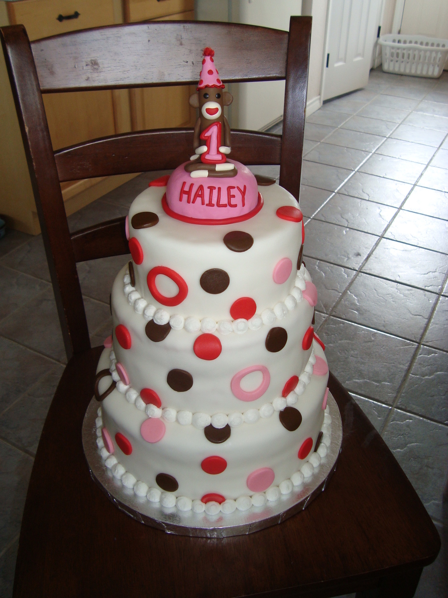 Cute sock monkey cake. Sad to say I did NOT make the topper. The girls mother purchased it off the internet. This was my first time to do a dummie cake. The top tier is fake. Hope yall like.
