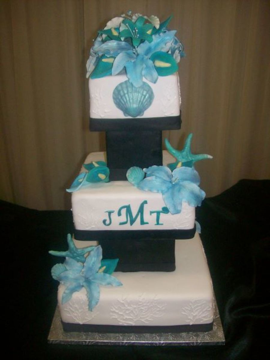 Three diffrent types of gumpaste Lilies, gumpate sea shells, hand piped coral, Client provided the seperators. Rum cake, Dark Chcolate marble cake, and Almond cake.