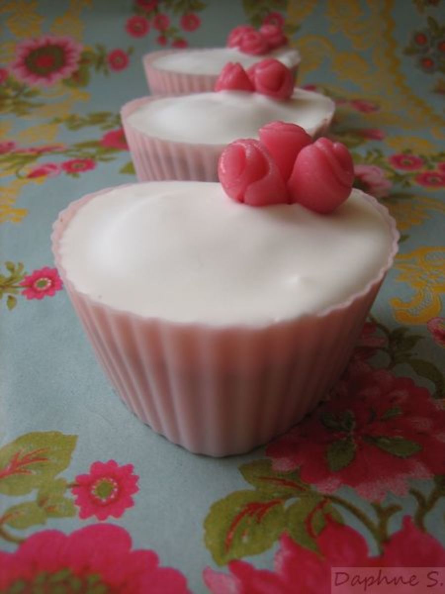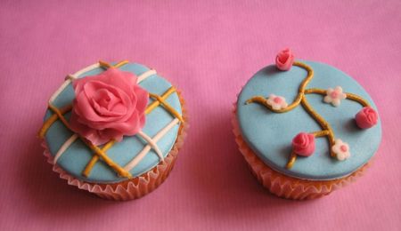 Cupcakes baked in heart shaped silicone cases. Covered with white royal icing and decorated with little pink roses made out of marzipan.