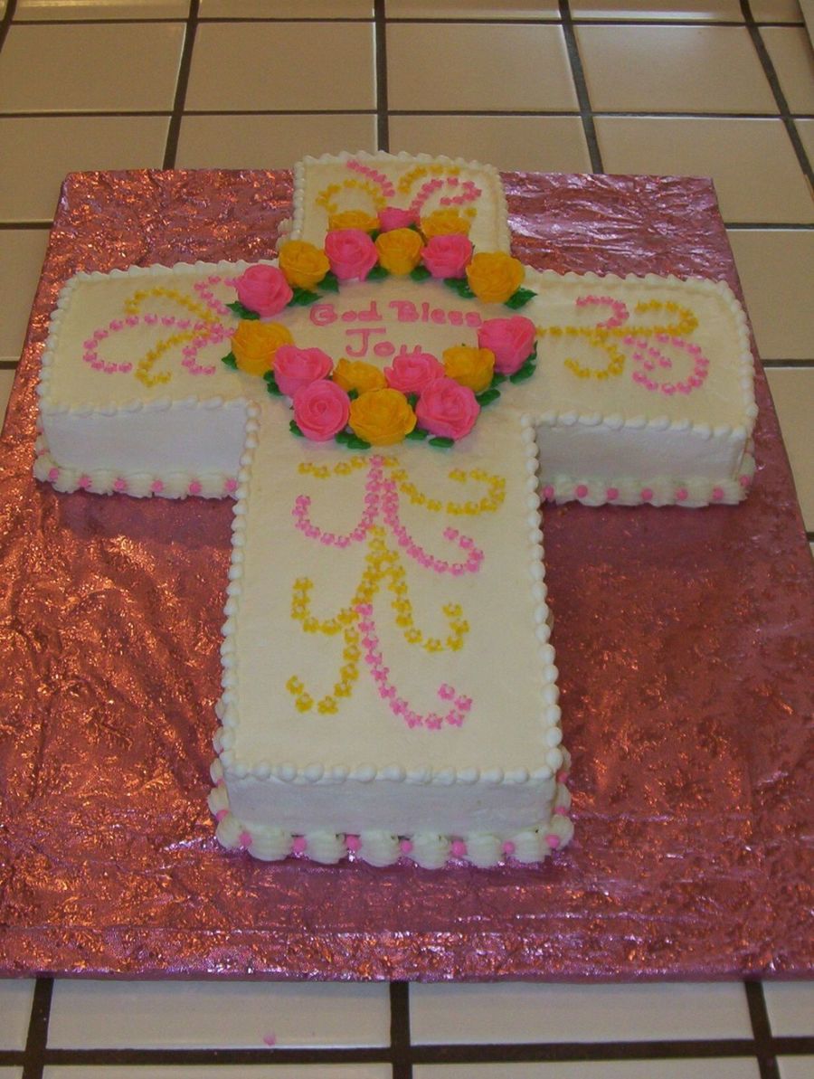 This was my first baptism/cross cake. I used a 11x15 sheet cake (yellow with lemon curd filling). Vanilla buttercream with buttercream roses. I got the design idea from this site (Thank you so much!). I even got another order for this same cake from someone attending the baptism.