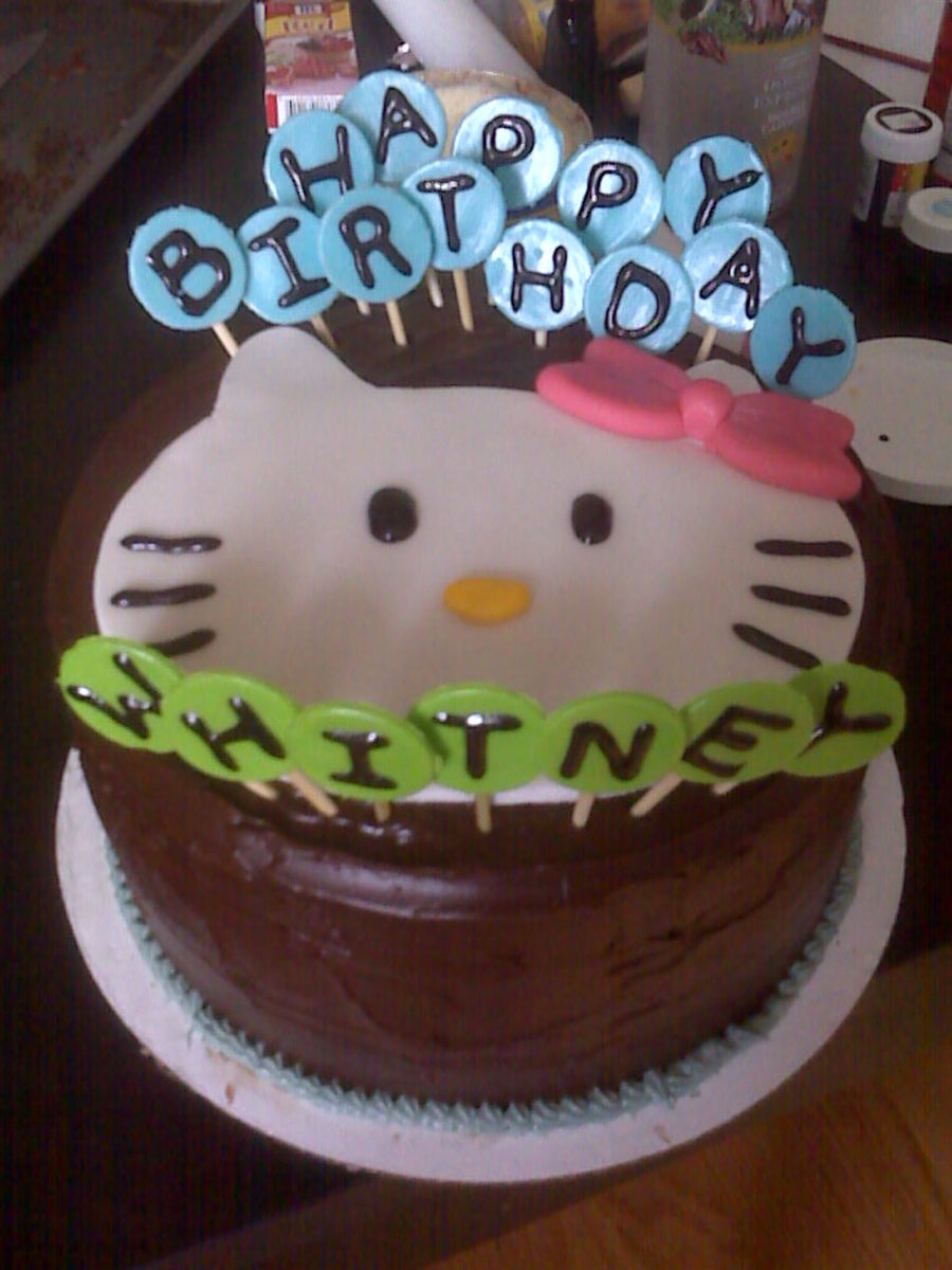 Mocha Espresso Cake w/ Espresso Liquor inside layered and frosted with a Chocolate Ganache. Hello Kitty face and Candy Lollies are all Fondant blended with Gumpaste, food coloring and pearl dust.