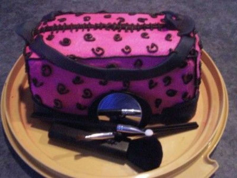 8" square cut in half and iced to look like a trendy make up bag. The makeup tools are real.