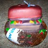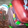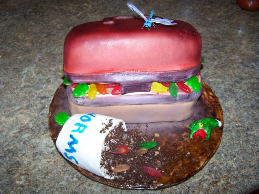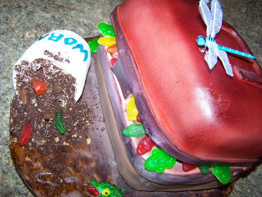 This was made for my Dad's 50th birthday. I used gummy worms, frogs and sweedish fish just for fun. The 'dirt' was ground chocolate cake crumbs with samshed heath bars. The cake was a hazelnut, yummm.