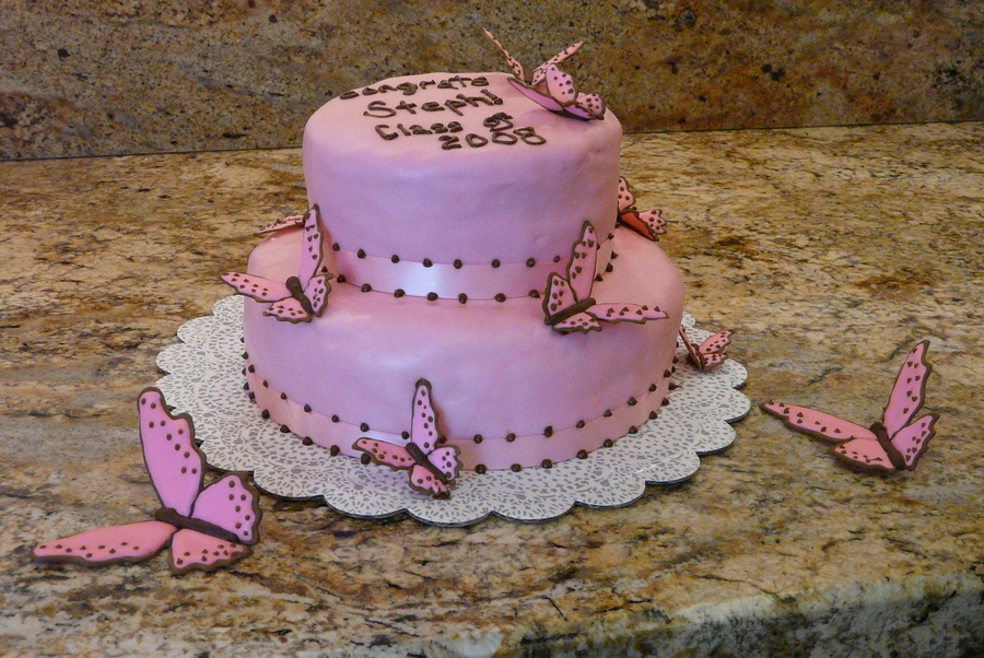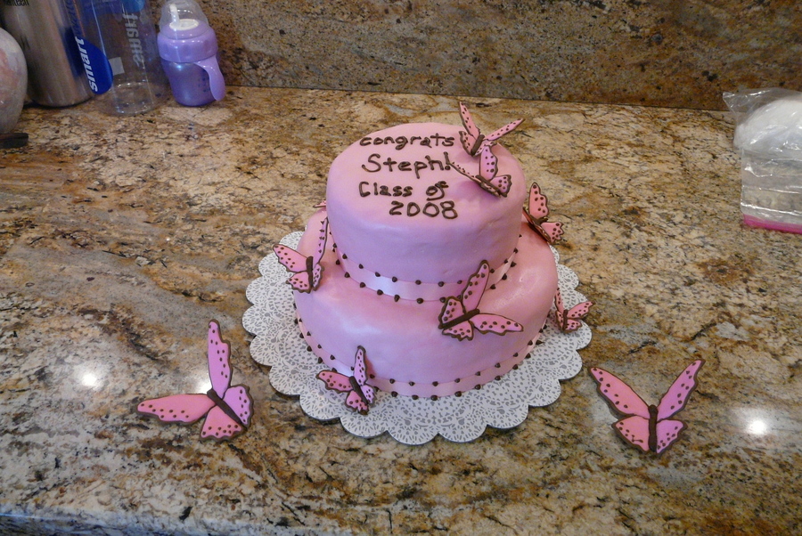 Graduation cake I did for my sister a couple of years ago. Loved how it turned out. The cake is covered in MMF and the butterflies are royal icing. TFL