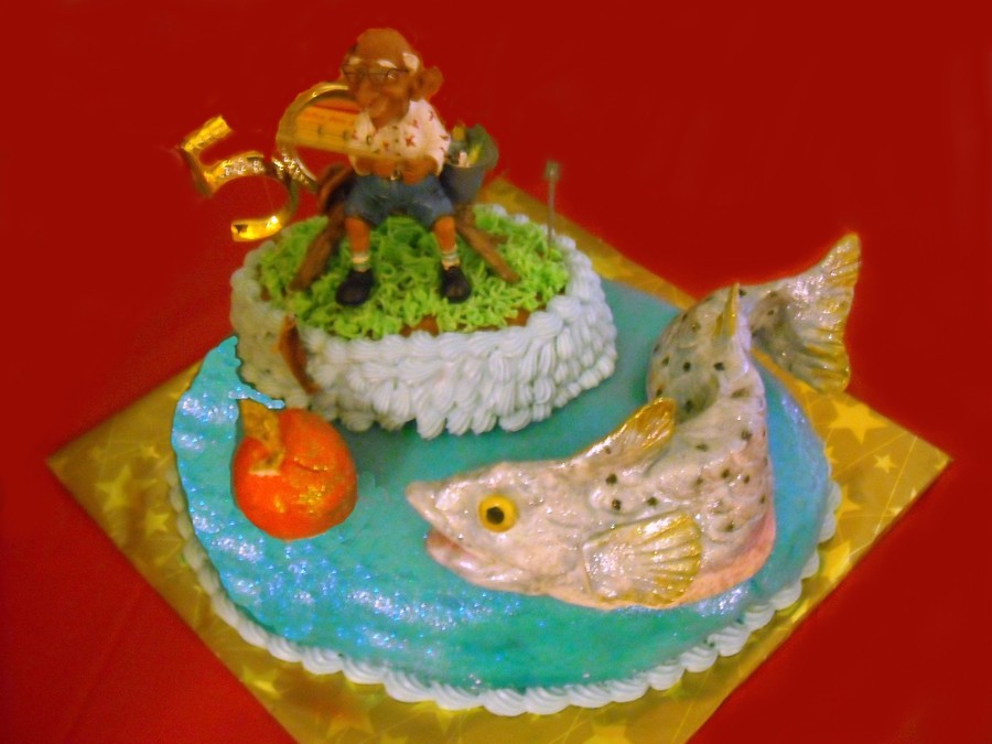 This was for my brother's 50th birthday. He belongs to a fishing group called "Team Apple" (the reason for the apple). The fish was life size made of fondant and colored with disco dust. The water was poured sugar. Thanks for looking.