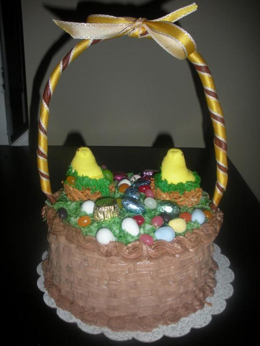 Chocolate cake wtih chocolate buttercream. Green coconut "grass" with peep haystacks in the basket. Handle is modeling chocolate over wire with real yellow ribbon & bow.