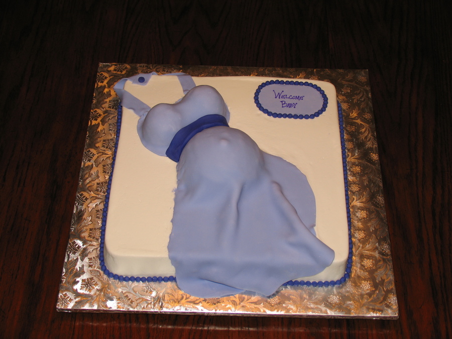 My first attempt making a Baby Belly cake for SIL baby shower. White Velvet cake. Square cake iced in buttercream, belly covered in Fondant.