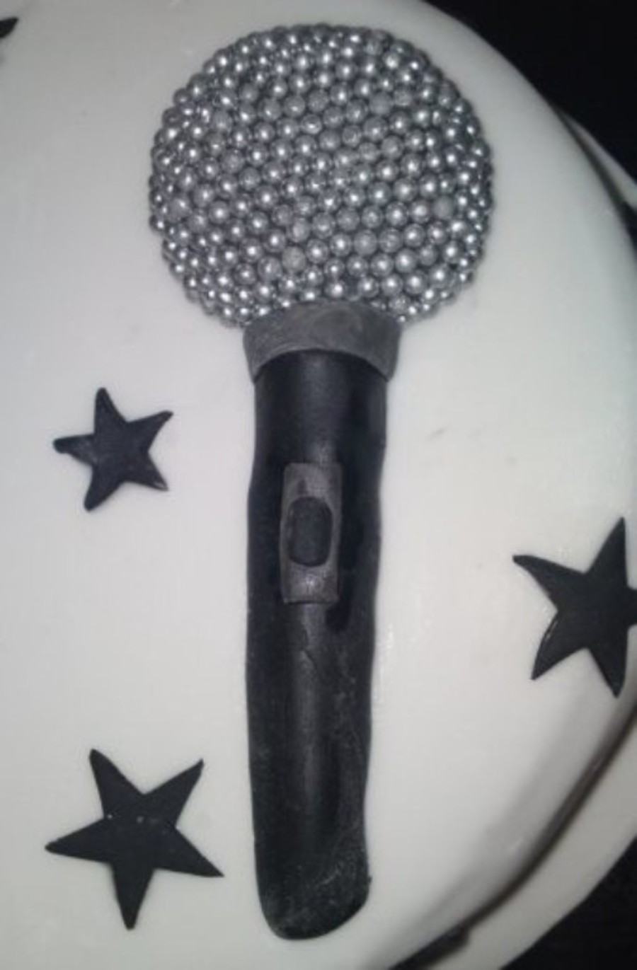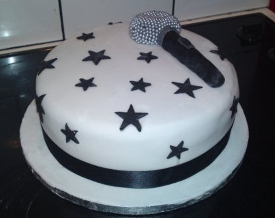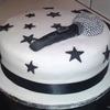 My 3rd cake. This cake was chocolate fudge cake covered in fondant. The stars and the microphone are fondant. The head of the microphone is covered in silver cake decorating balls. I really enjoyed doing this one. TFL