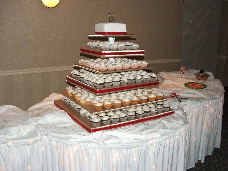 300 cupcakes - 5 different flavors. The cupcake tower was home made from plywood and fabric.