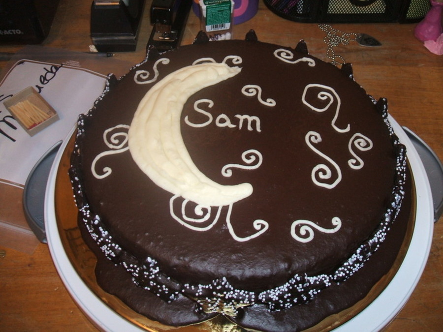 She requested something pretty with lots of chocolate. My first attempt at ganache. The boarder is dark chocolate star cookies from Trader Joe's.