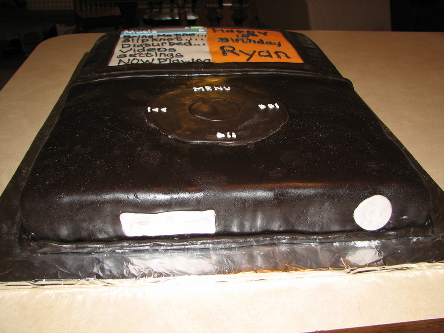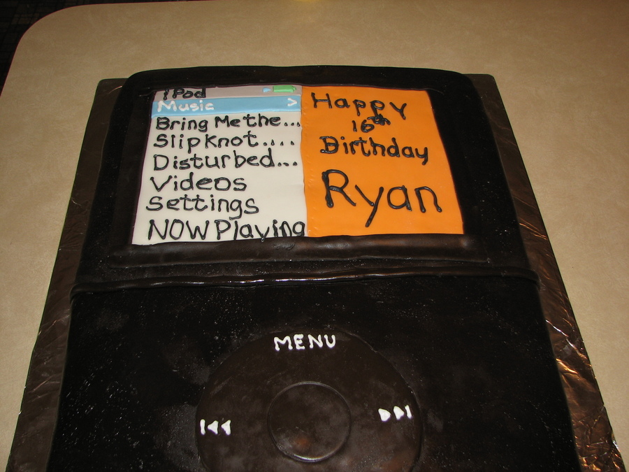 This is cake made for a 16 year old. I used chocolate fondant and colored it black. didn't have to use very much black. The play list is his favorite groups.