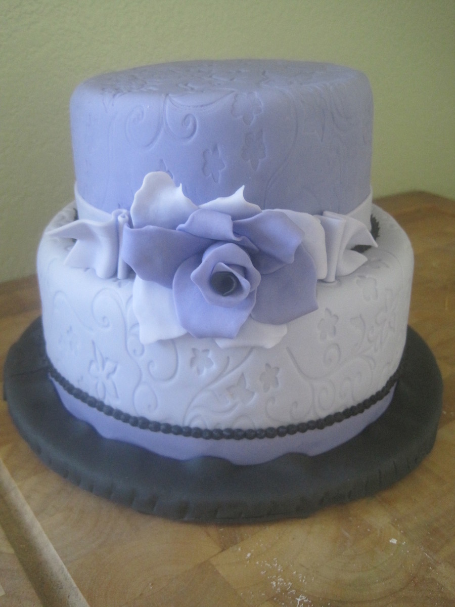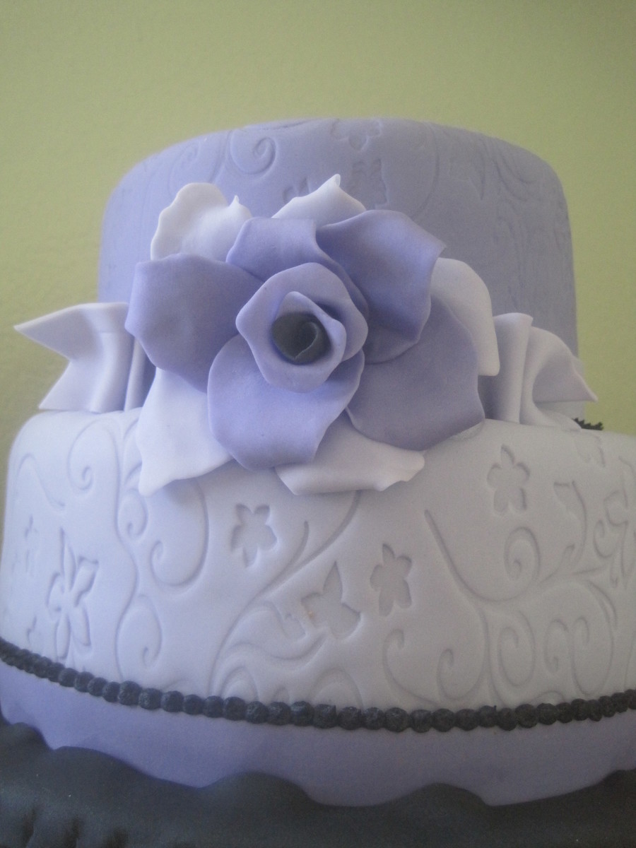 White Choc. Crumb and buttercream filling. I made this for my friends grandmother's birthday. Fondant flower, first time using a roller press for the design. Thanks for looking!