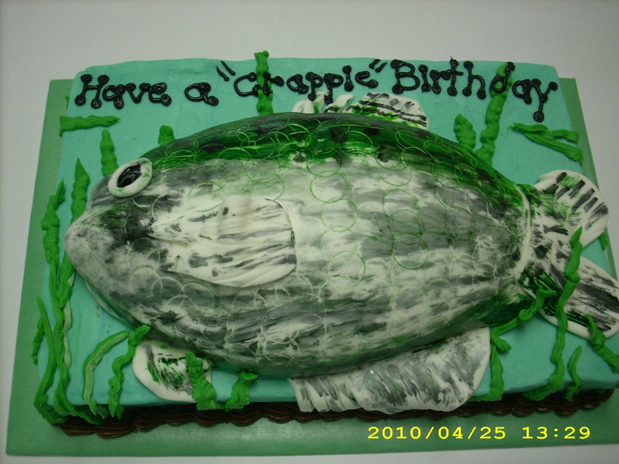 This is another attempt to do a crappie cake, someone requested, why I don't know, because my other one looked more like a flounder. WASC on bottom, and chocolate cake on top. Sugarshacks bc, first time with that. MMF on fish. Thanks for looking!