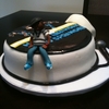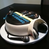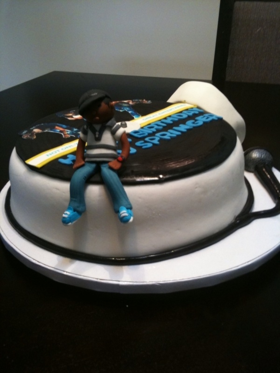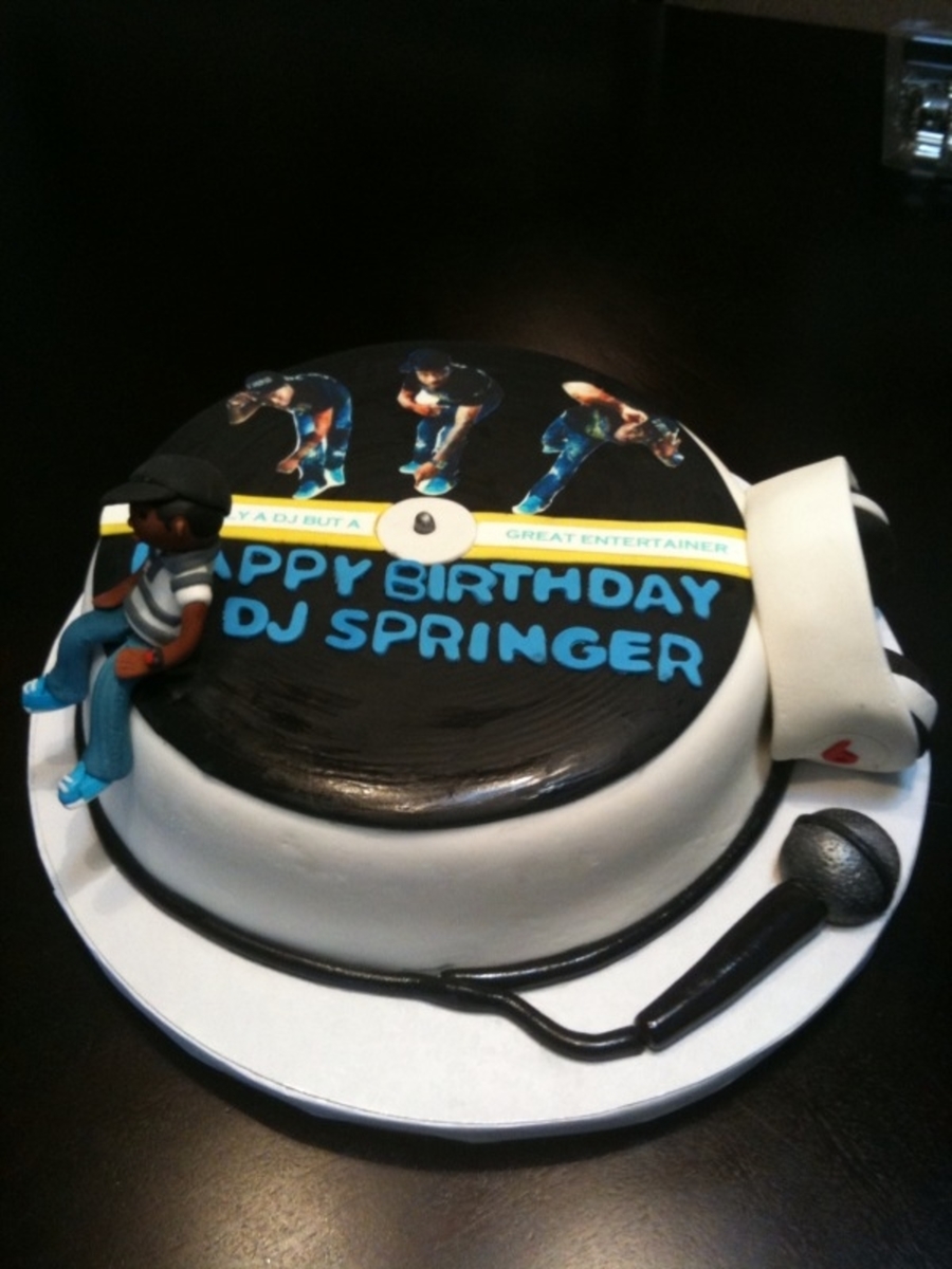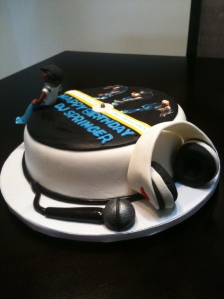 This cake was made for a DJ. The client requested a vinyl with pictures od him and his favorite Dr Dre headphones.