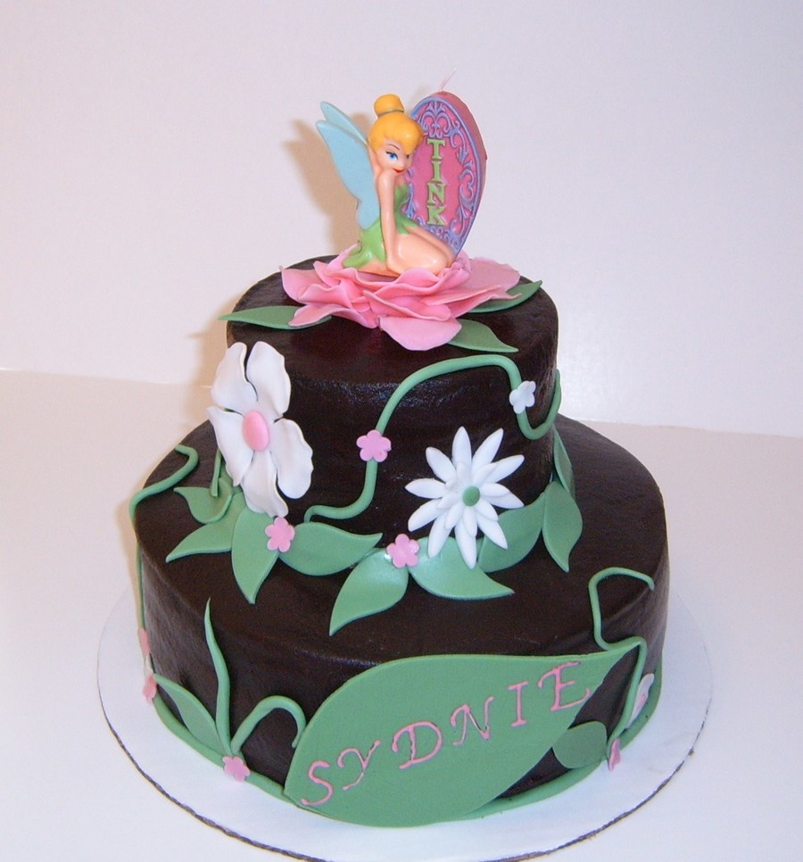 chocolate cake with chocolate buttercream covered in dark chocolate buttercream, fondant accents and tink candle