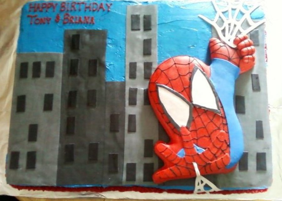 Inspired by fellow Cake Central member, kpk125, however I made a few changes. It is a full sheet cake with buttercream icing and fondant buildings and covering Spiderman cake. I couldn't borrow the Wilton Spiderman cake from anyone, so I carved it by hand from a quarter sheet cake...