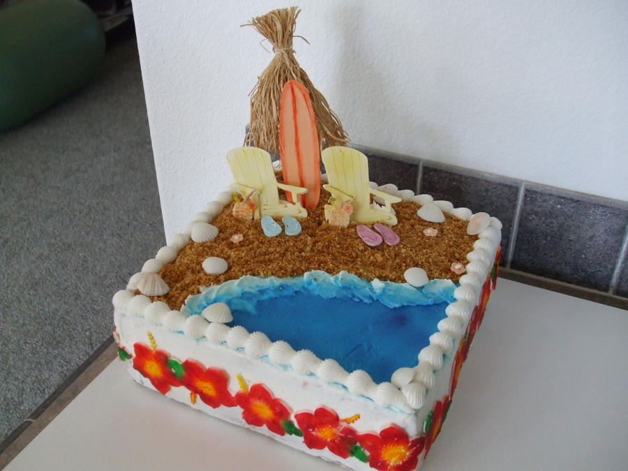 My first cake with the Cricut. Hibiscus boarder, surfboard, pineapple drinks, chairs, flip flops all made with cricut cake. Buttercream frosting with fresh strawberrys and cream filling in a white cake.