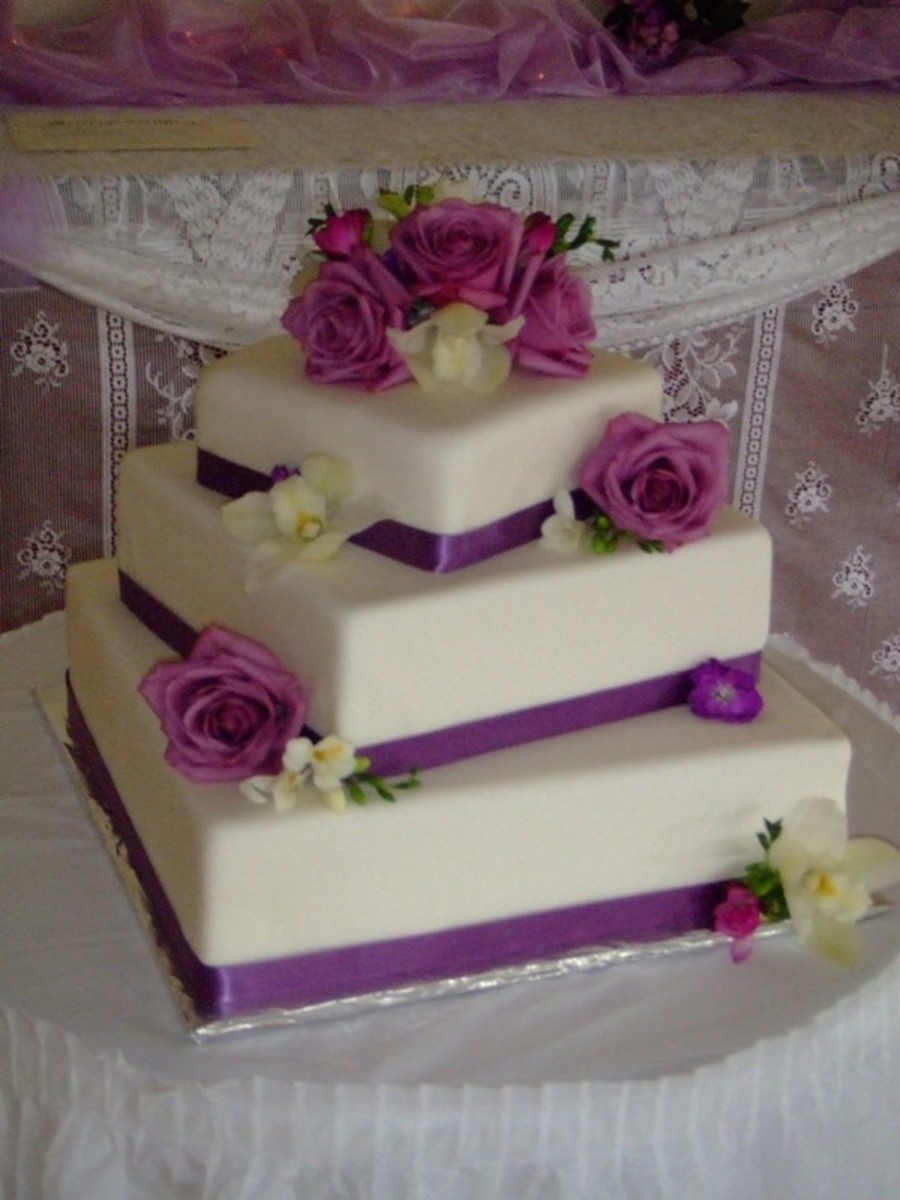 Top tier is real cake, bottom two are dummy cakes. Ribbon around edge and real flowers.