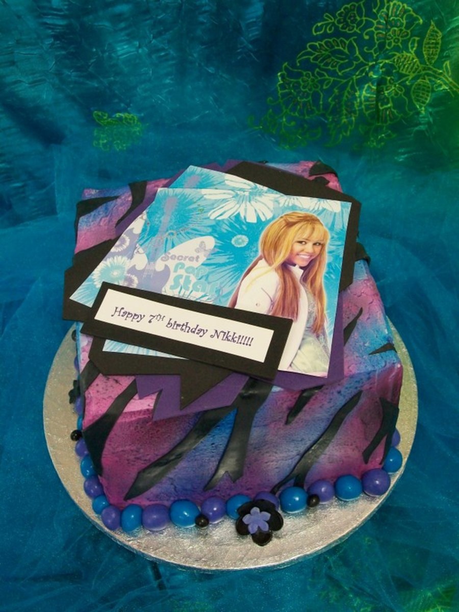 Hannah Montana cake airbrushed blue and purple finishes with fondant accents