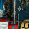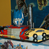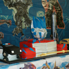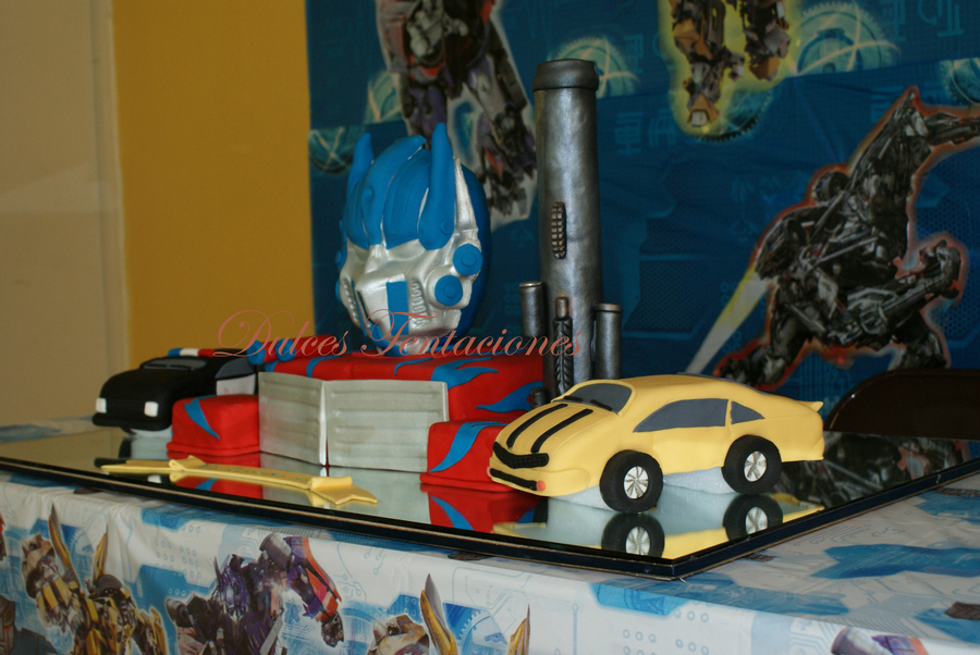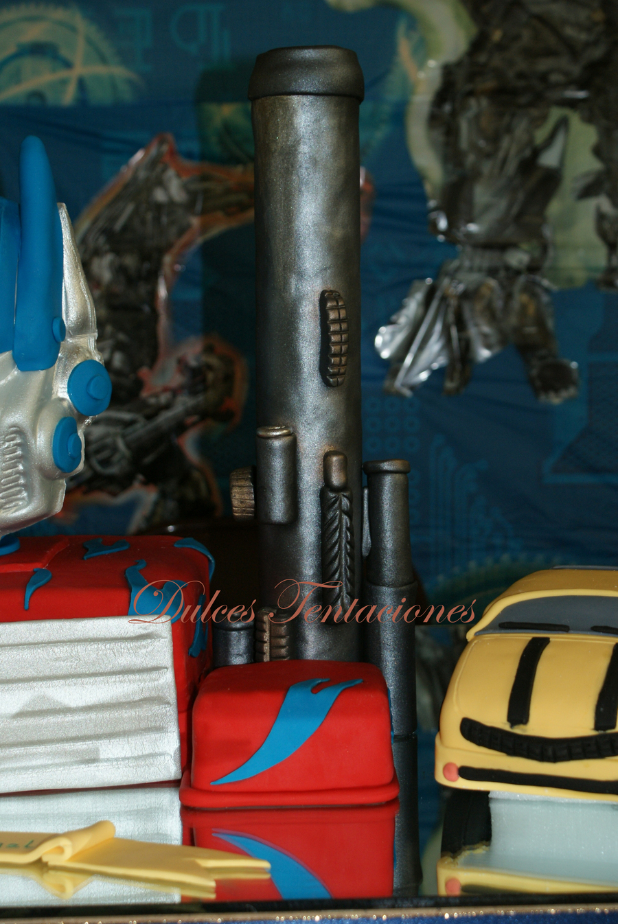 This I made with a 9 x 13" sheet pan cake x 4" high for the body . Then I made anoter 9 x 13" and cut in half and carved the cars, For the pipe I coverd a paper tube with Krispe treats ,then cover in black fondant and airbrushed with silver, for the head I made it in krispe treats also and coverd with blue fondant and for the mask I used a Halloween mask and shaped it over with Gumpaste , airbrushed in silver and then added the blue accents