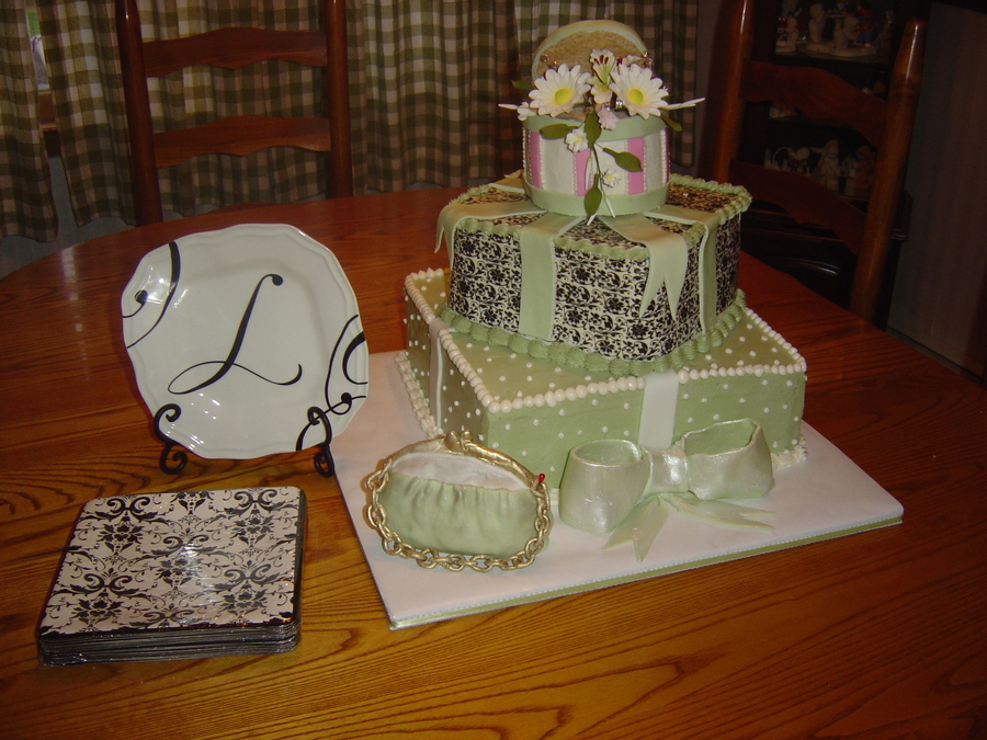 Bottom tier is iced in buttercream, 2nd tier I used chocolate transfer on cake, top tier is iced in buttercream; purse is molded out of rice krispie treats and covered with fondant, purse chain is handmade gumpaste chain; fondant ribbon/bow