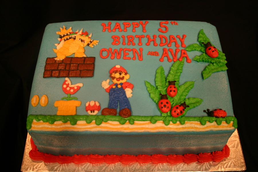Twins wanted different themes, and Mom wanted one cake, so we combined Super Mario Bros. and ladybugs on a vanilla cake filled with strawberries and whipped cream.