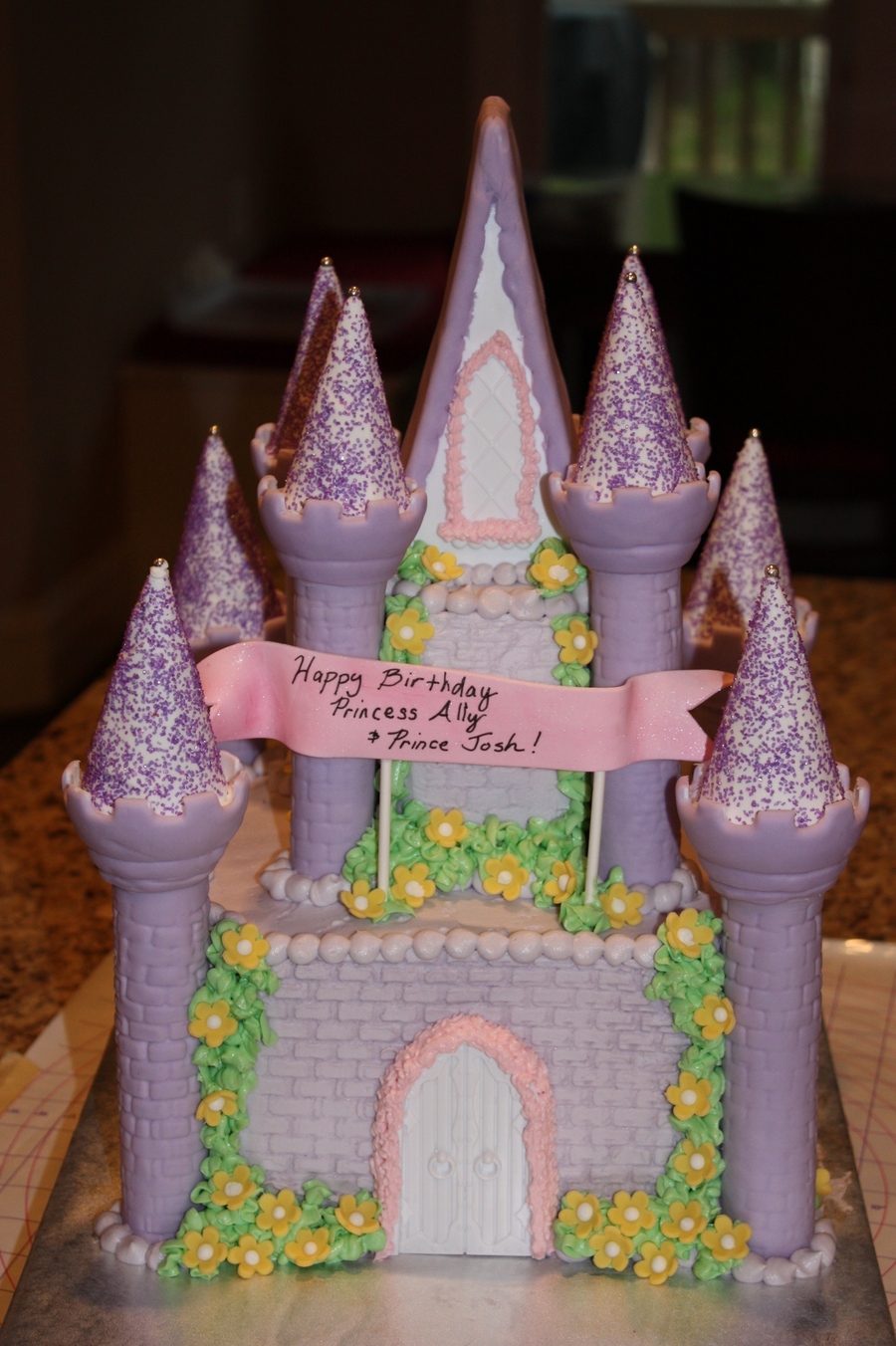 A small lavendar castle for a 5-year-old princess! This was an 8" with a 4" on top.