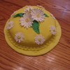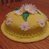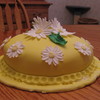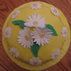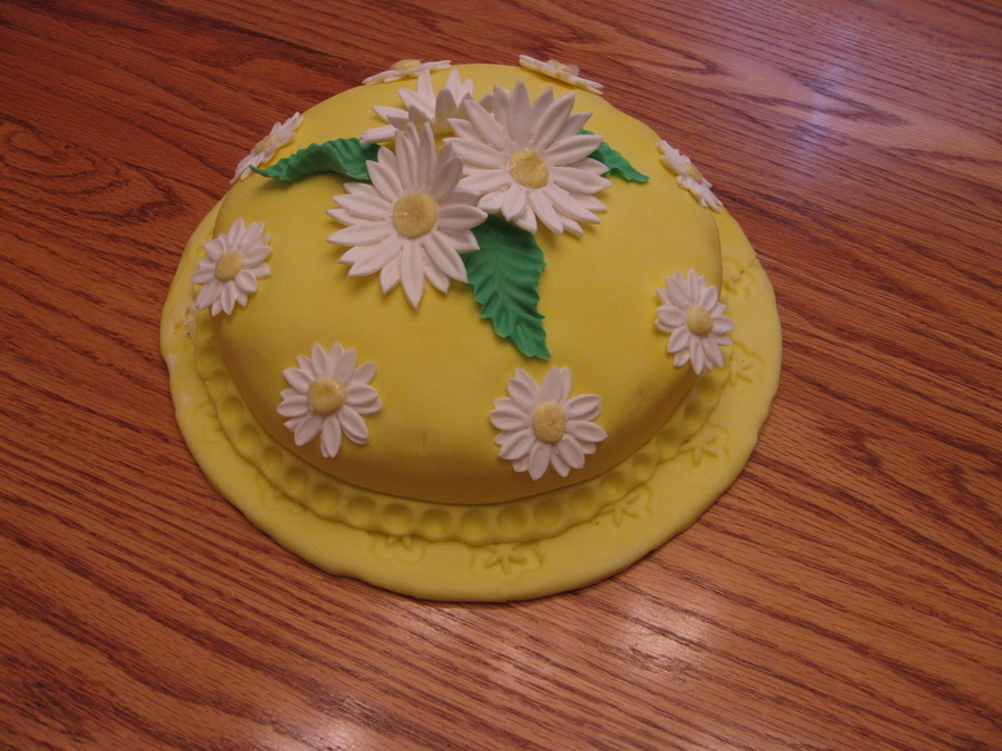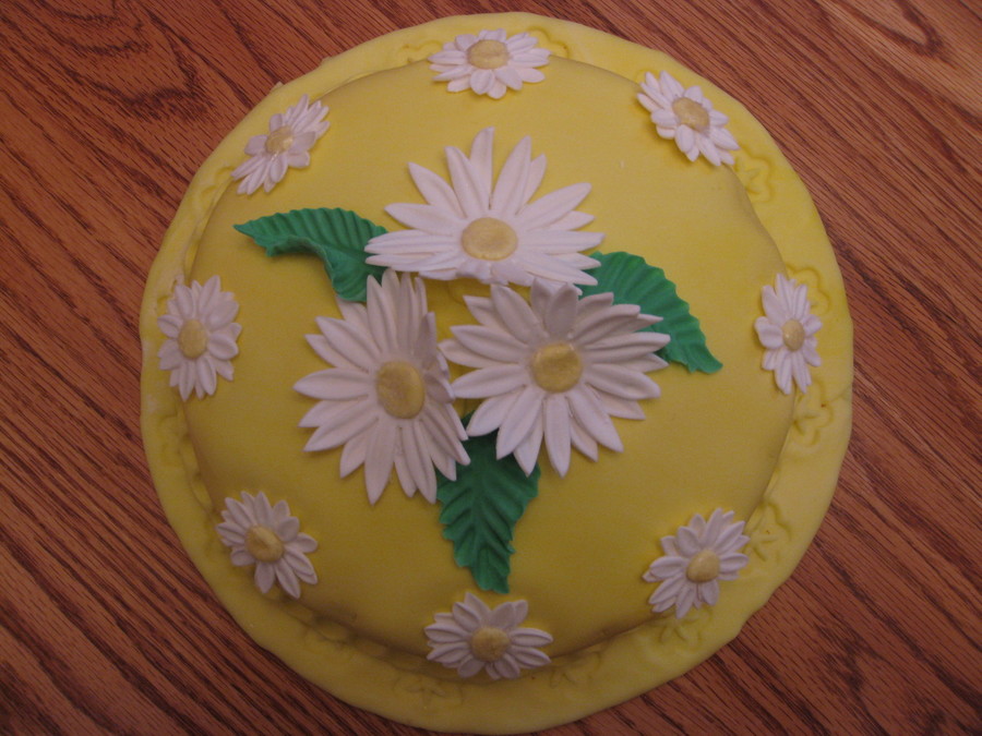 One layer cake covered in fondant with gumpaste daisies and leaves.