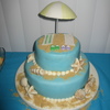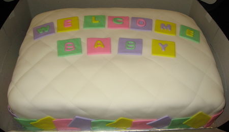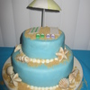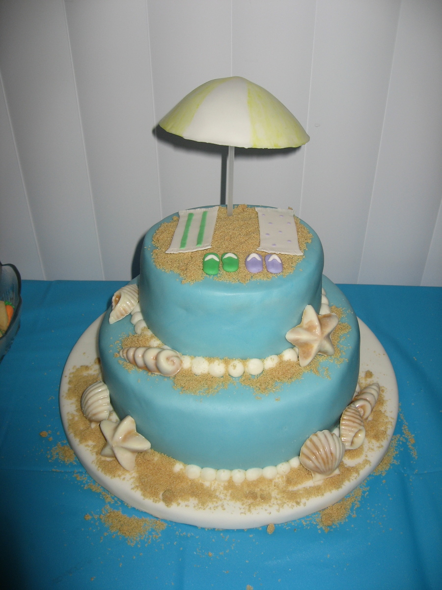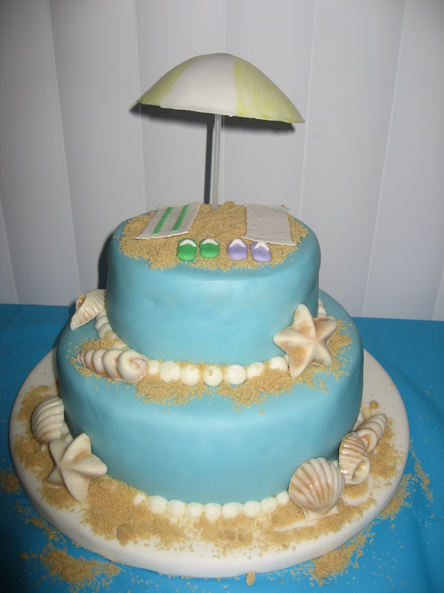 Covered in buttercream fondant and decorated with white chocolate seashells.