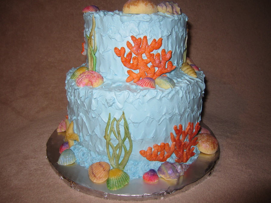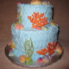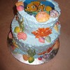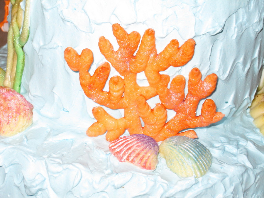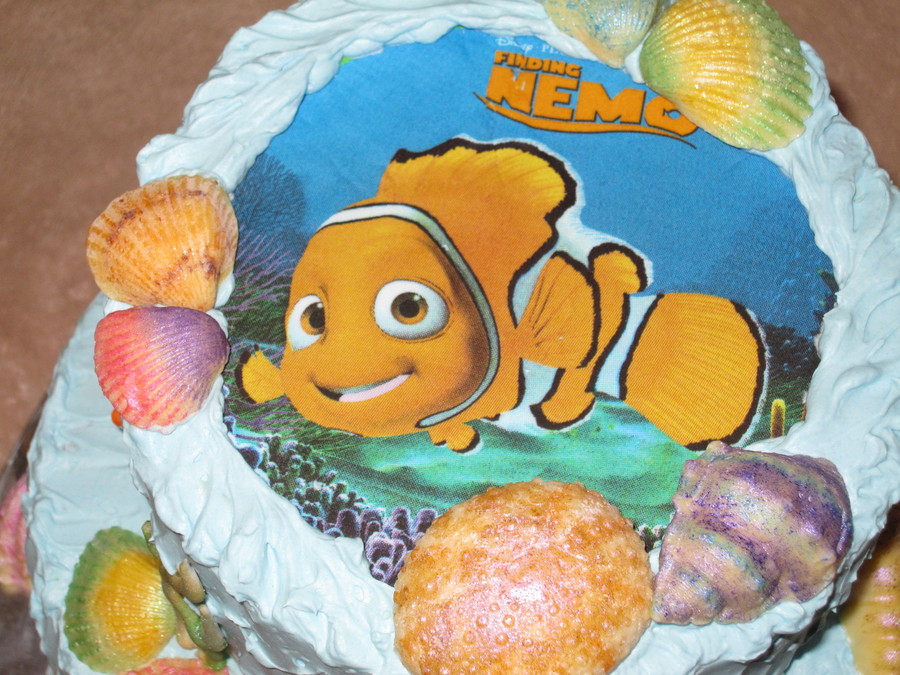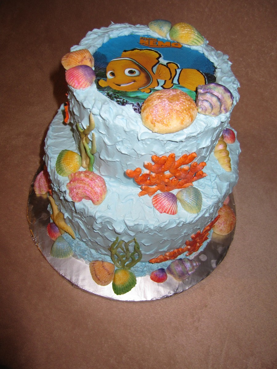Finding Nemo theme. Buttercream icing, edible image on top, hand painted white chocolate shells and royal icing corals.