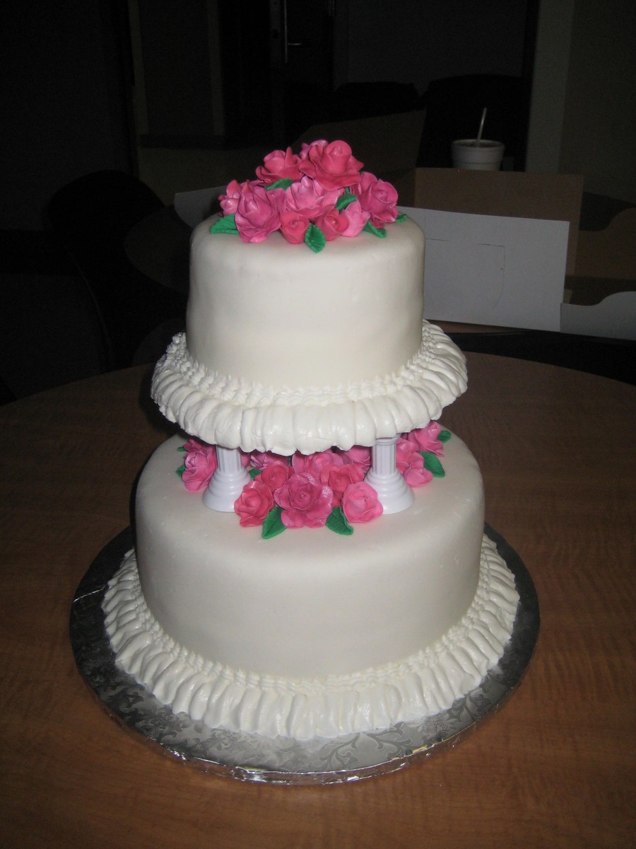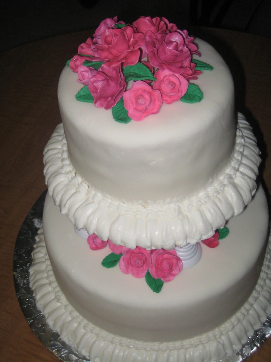 6" & 10" rounds. Covered in "Rhonda's Ultimate MMF" (I think I still prefer Satin Ice). My fondant work wasn't the greatest, and my icing was a bit too soft (practice makes perfect, right?), but I thought my roses looked great :) TFL!