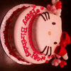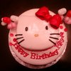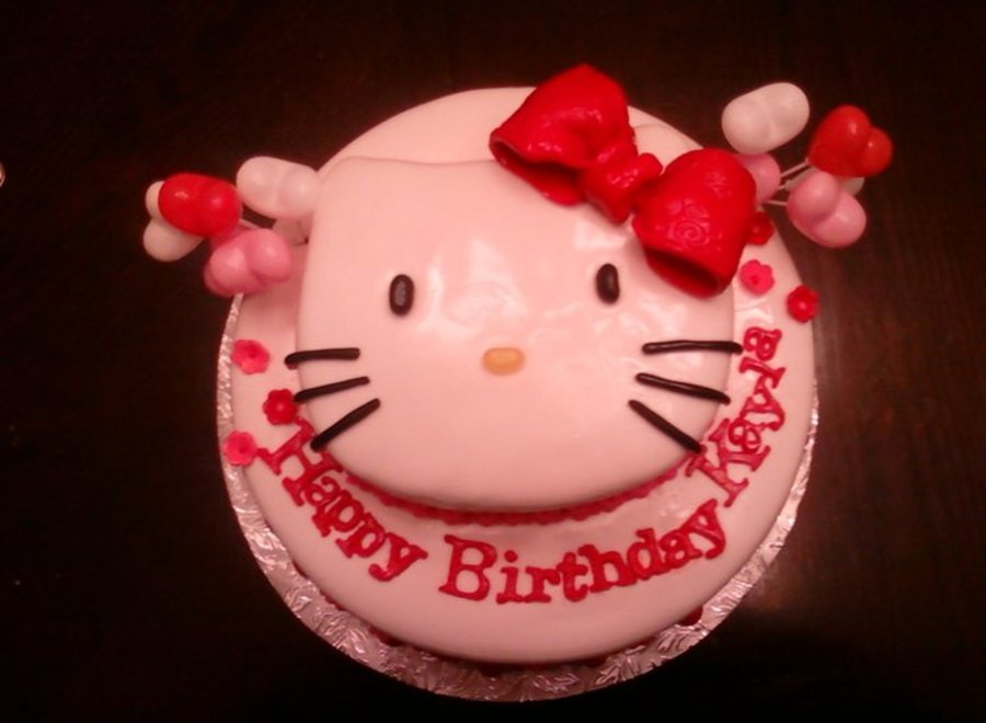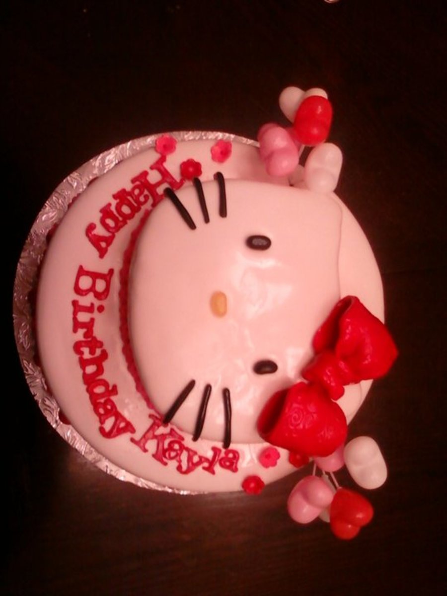 This is a 10'in 2 layer white cake and the Hello Kitty was carved. The bow,whiskers and flowers are all gumpaste and the eyes and nose are jelly beans.