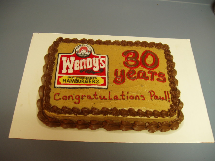 Chocolate lover's cake with mocha and dark chocolate mocha icing. Wendy's logo is fondant. The actual Wendy is paper because I couldn't pipe features that small and I don't have an edible ink printer.