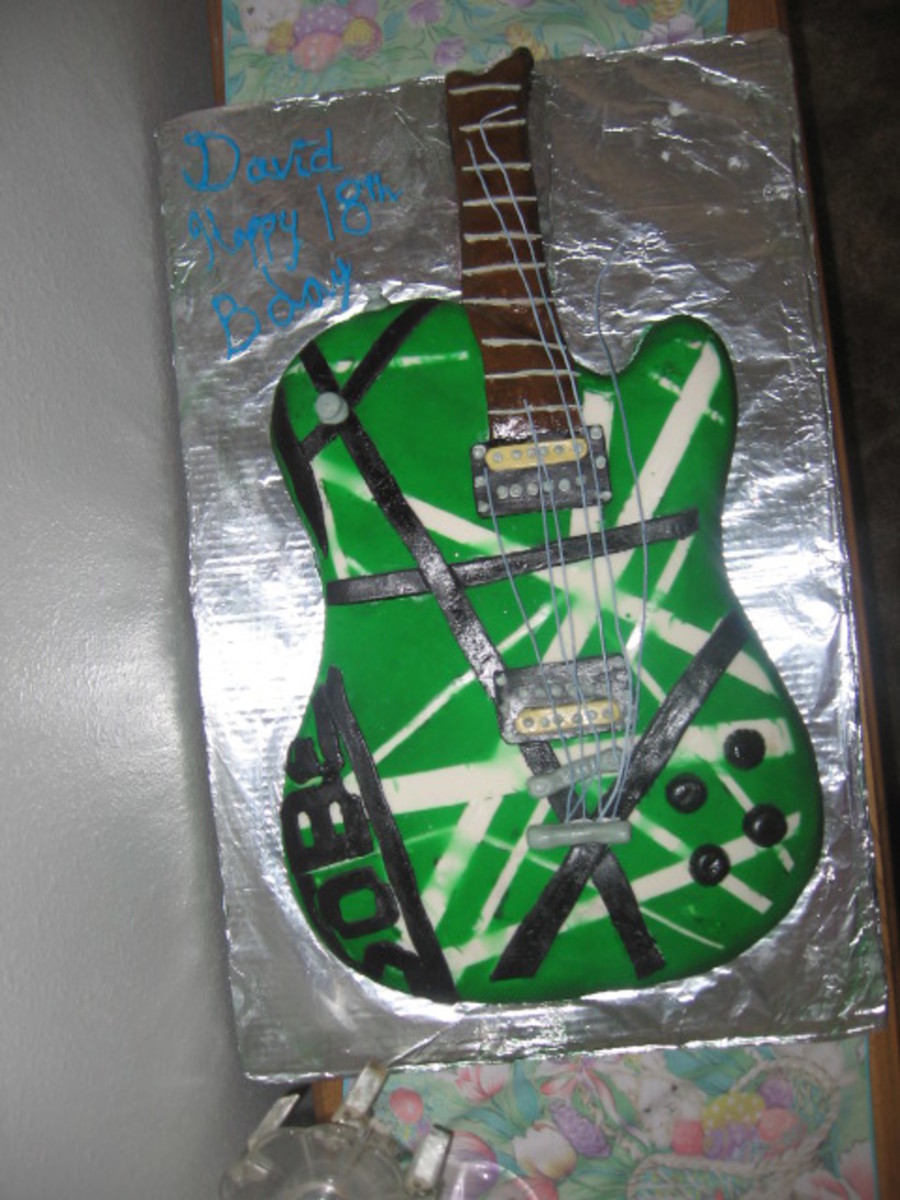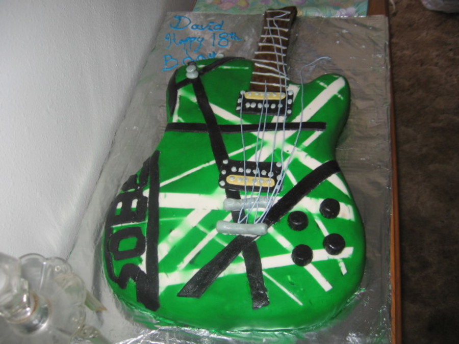 I made this cake for my brothers birthday, chocolate cake for the guitar and rice crispies for the handle. I covered it with fondant, and made a stencle and use this spray in a can stuff I got at a craft store for the green. Turned out pretty good, was a big challenge. I had a problem with the filling seeping into the rest of the making it a bit soggy.