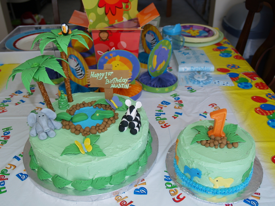 A first birthday for a co-worker's son, and the matching "smash" cake for the birthday boy. Pretzel sticks and fondant leaves to make the palm trees. Hand make animals (some better than others!). Inspired by other cakes I've seen at Cake Central. I love this web site!