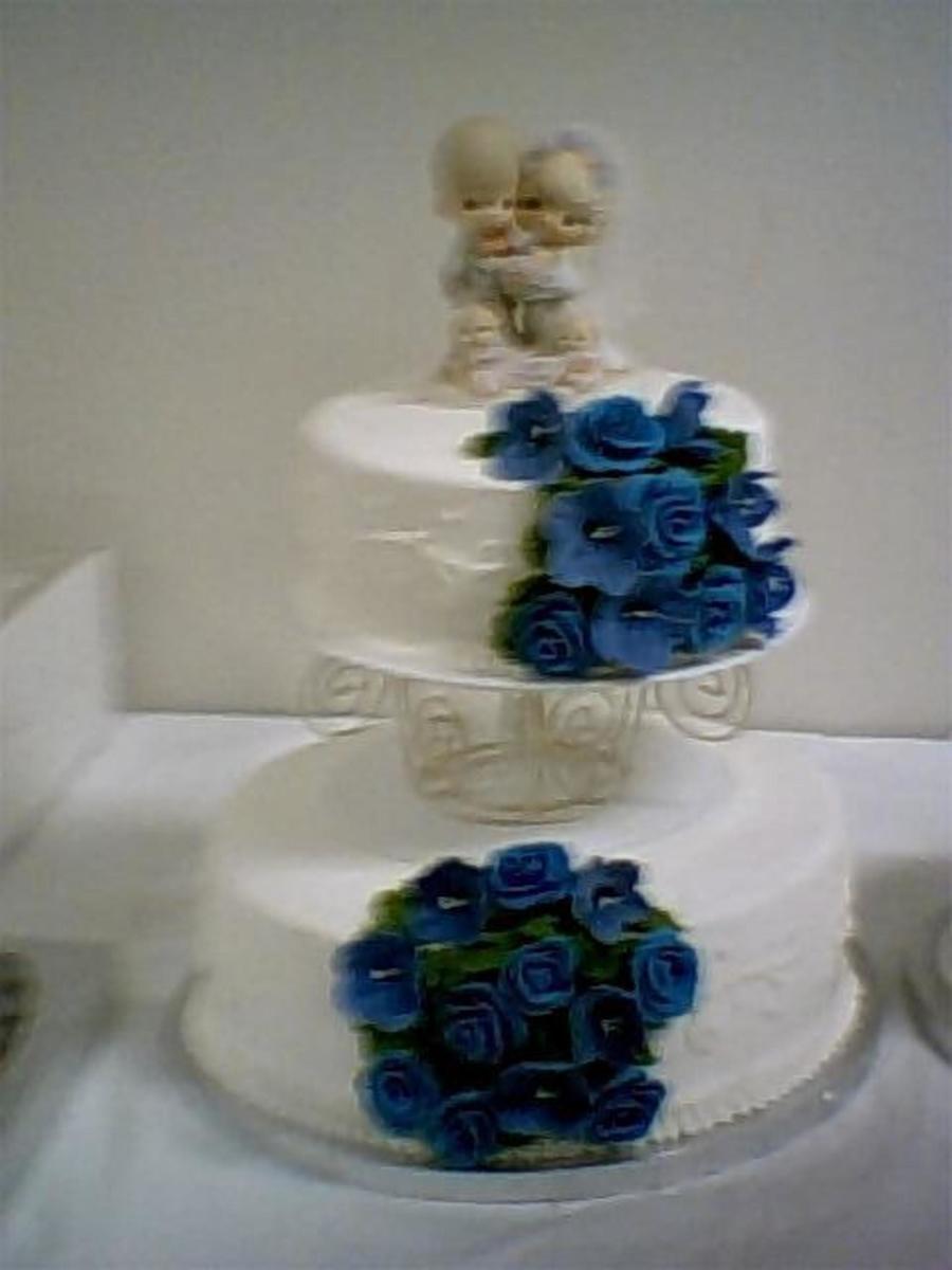 Yellow butter cake with white chocolate mousse filling and buttercream frosting. All of the flowers are made with fondant.