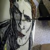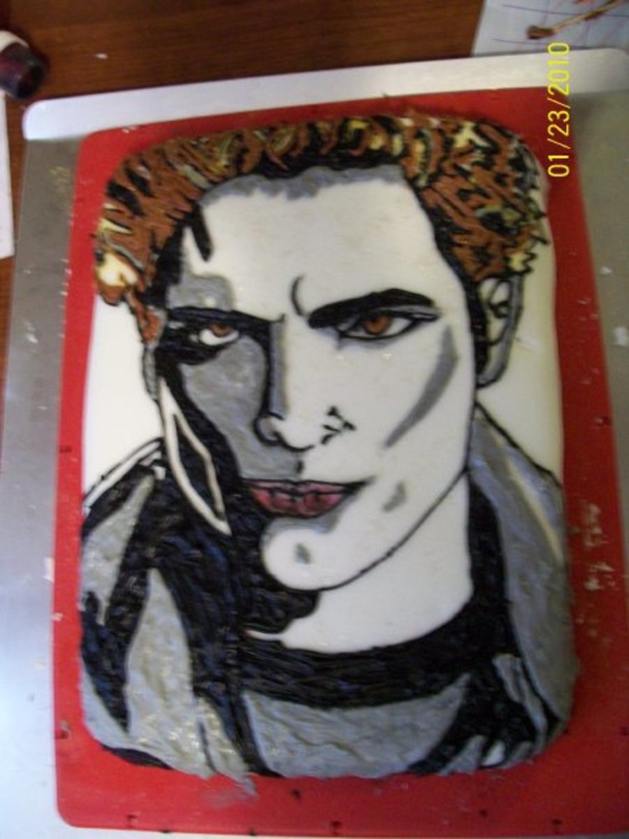 Edward Cullen's face in buttercream icing on a fondant covered 8x11 cake for a birthday cake. He also has cake sparkles where his face is "in the light'.