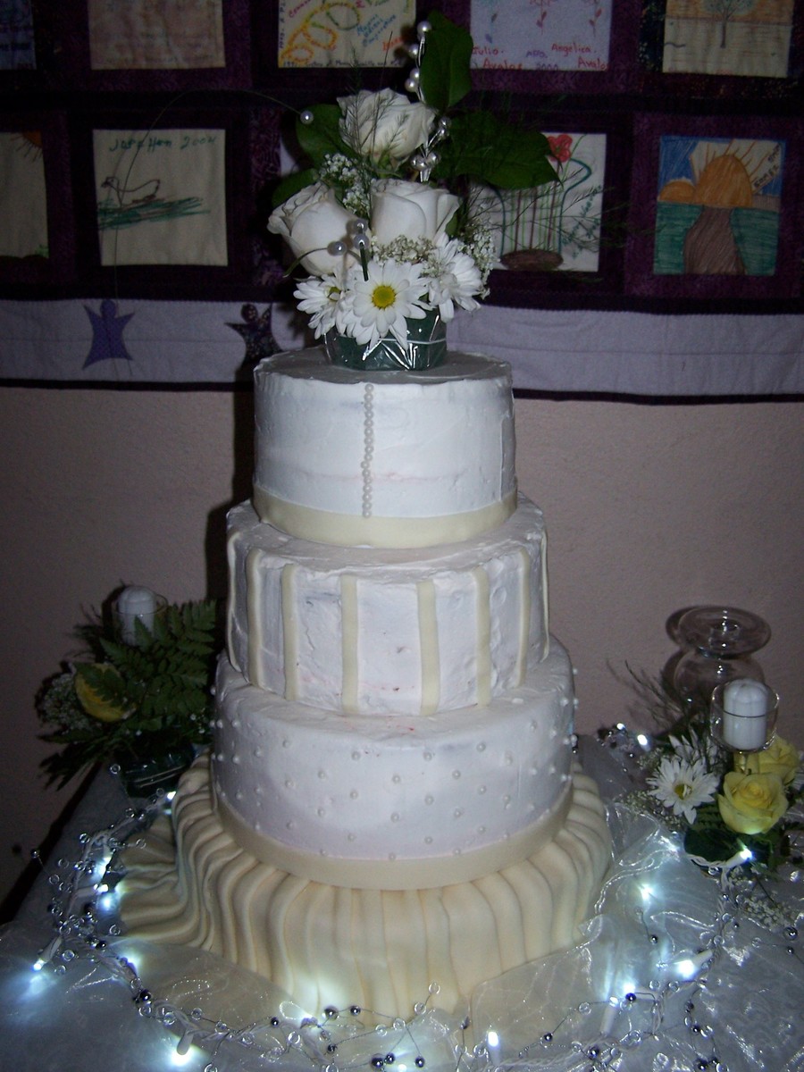 Didn't like how it turned out, had a lot of mistakes as you can see. Had a different design but was not able to do it. There was going to be a glass seperator between the top and 2nd tier but made the mistake of making the top tier too big. Overall the cake was good.